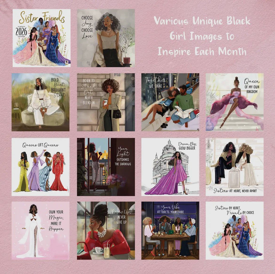 The 2026 Girlfriends Wall Calendar. Created by Cidne Wallace, this calendar is more than just a tool to track days. It’s a celebration of the beauty, resilience, and contributions of African American women. Each month reveals a distinctive, one-of-a-kind artwork that uplifts and inspires, echoing our mission to bring positive images of African Americans into homes, schools, and offices. This unique calendar stands out, embodying the beauty of the African diaspora and the strength of black culture.