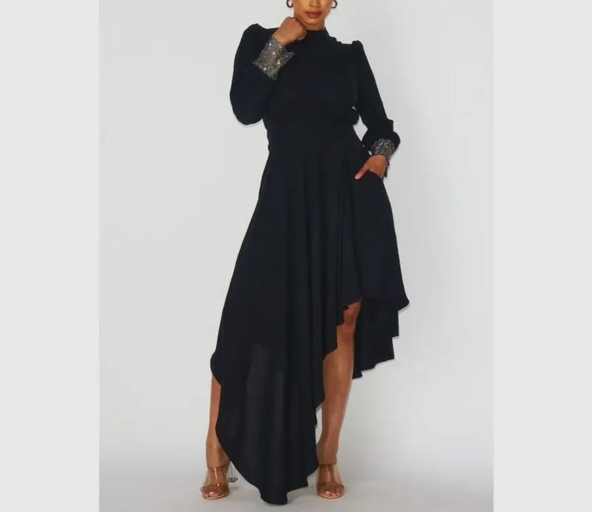 This dress features a sleek mock neck and long sleeves, providing a chic and sophisticated silhouette. With its solid color design, this dress exudes elegance and versatility, allowing you to accessorize and style it in countless ways. The asymmetric hemline adds a touch of drama and modern flair, making it perfect for making a statement on the dance floor.
